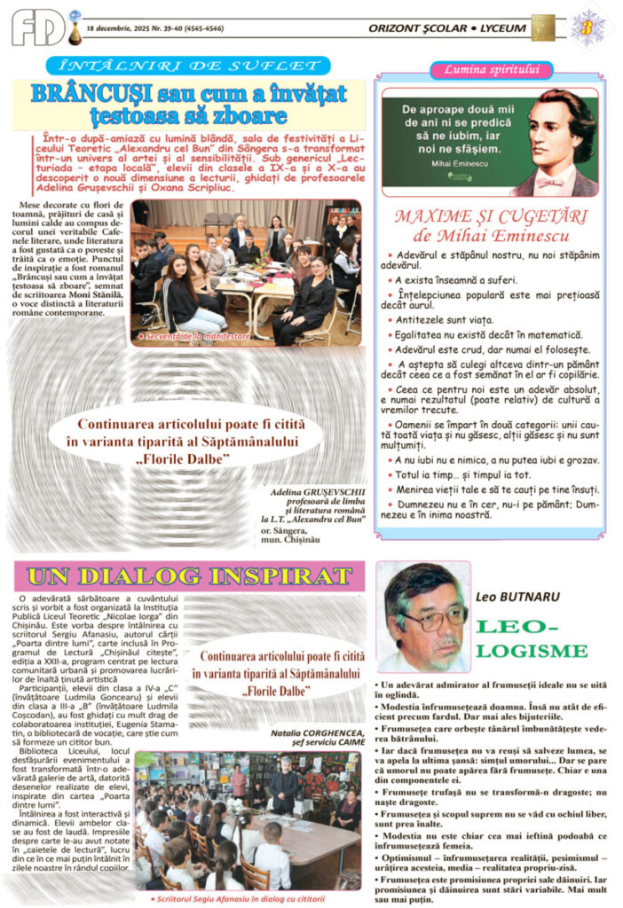 ORIZONT ȘCOLAR* LICEUM: ora de literatură; să scriem și să vorbim corect românește; dialogul generațiilor