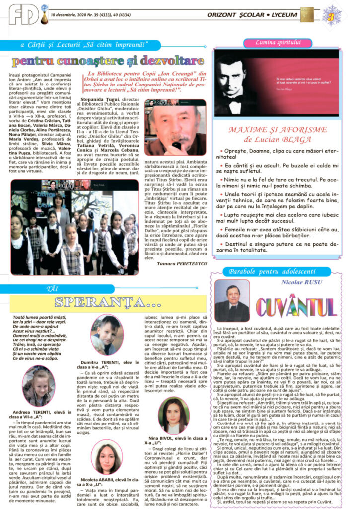 ORIZONT ȘCOLAR* LICEUM: ora de literatură; să scriem și să vorbim corect românește; dialogul generațiilor