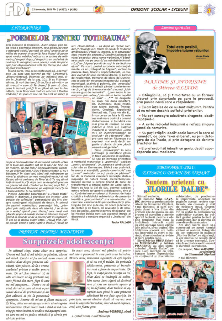 ORIZONT ȘCOLAR* LICEUM: ora de literatură; să scriem și să vorbim corect românește; dialogul generațiilor