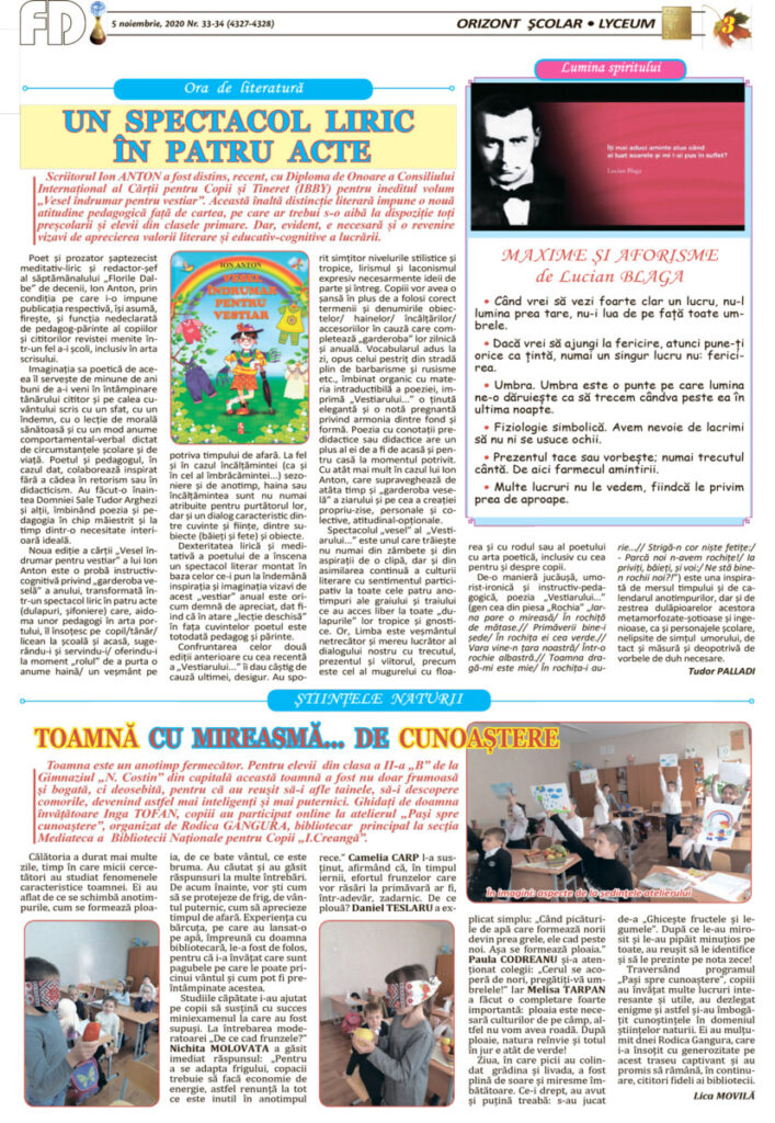 ORIZONT ȘCOLAR* LICEUM: ora de literatură; să scriem și să vorbim corect românește; dialogul generațiilor